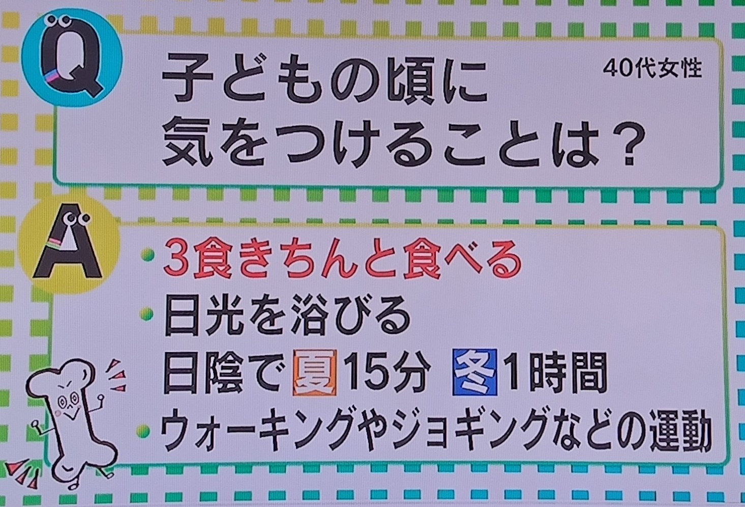 幼少期から、しっかり日光浴をし、三食バランスの良い食事を心掛け、適度な運動を習慣付けましょう(*^^*)