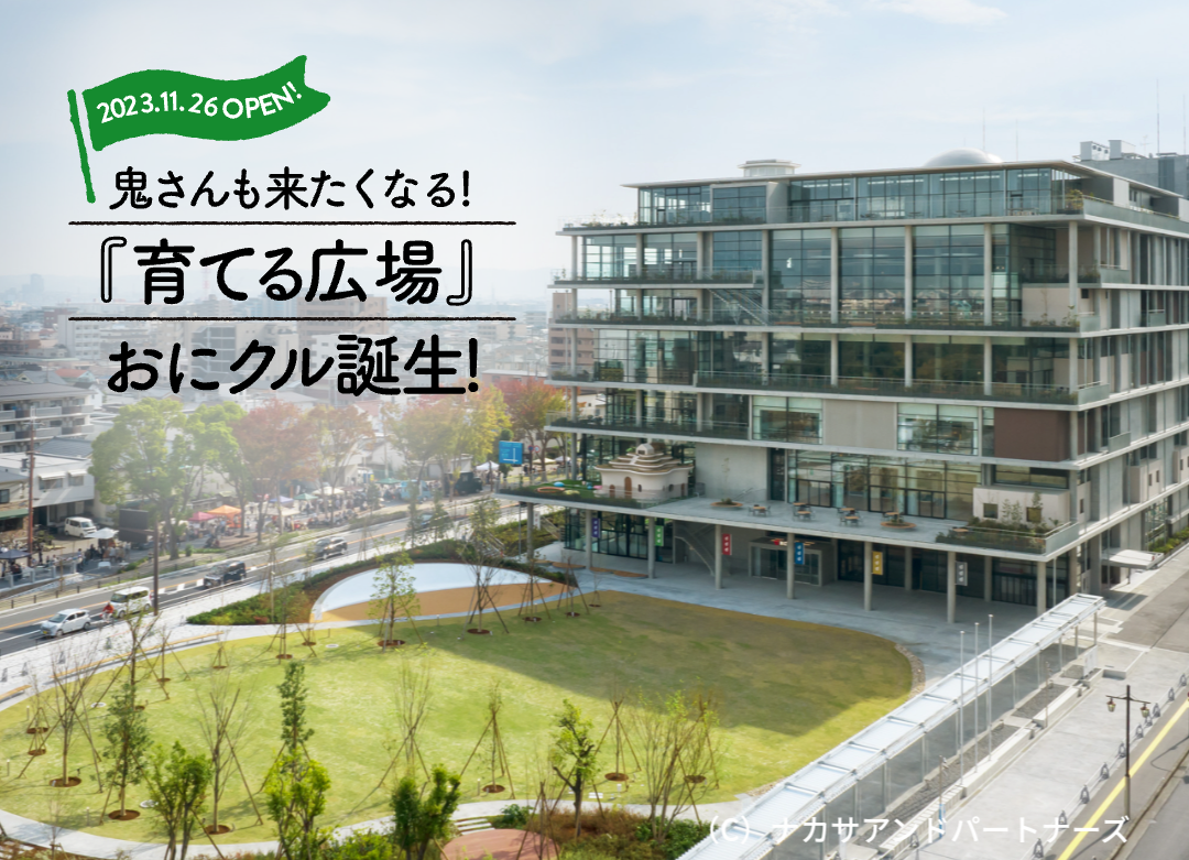 茨木駅と阪急茨木市駅の両駅を結ぶ「東西軸」と、元茨木川緑地の豊かな自然が広がる「南北軸」が交わっている、まちの中心部に誕生した「おにクル」は、新たなまちのシンボルとして、建築面でも特徴的な施設となっています。
