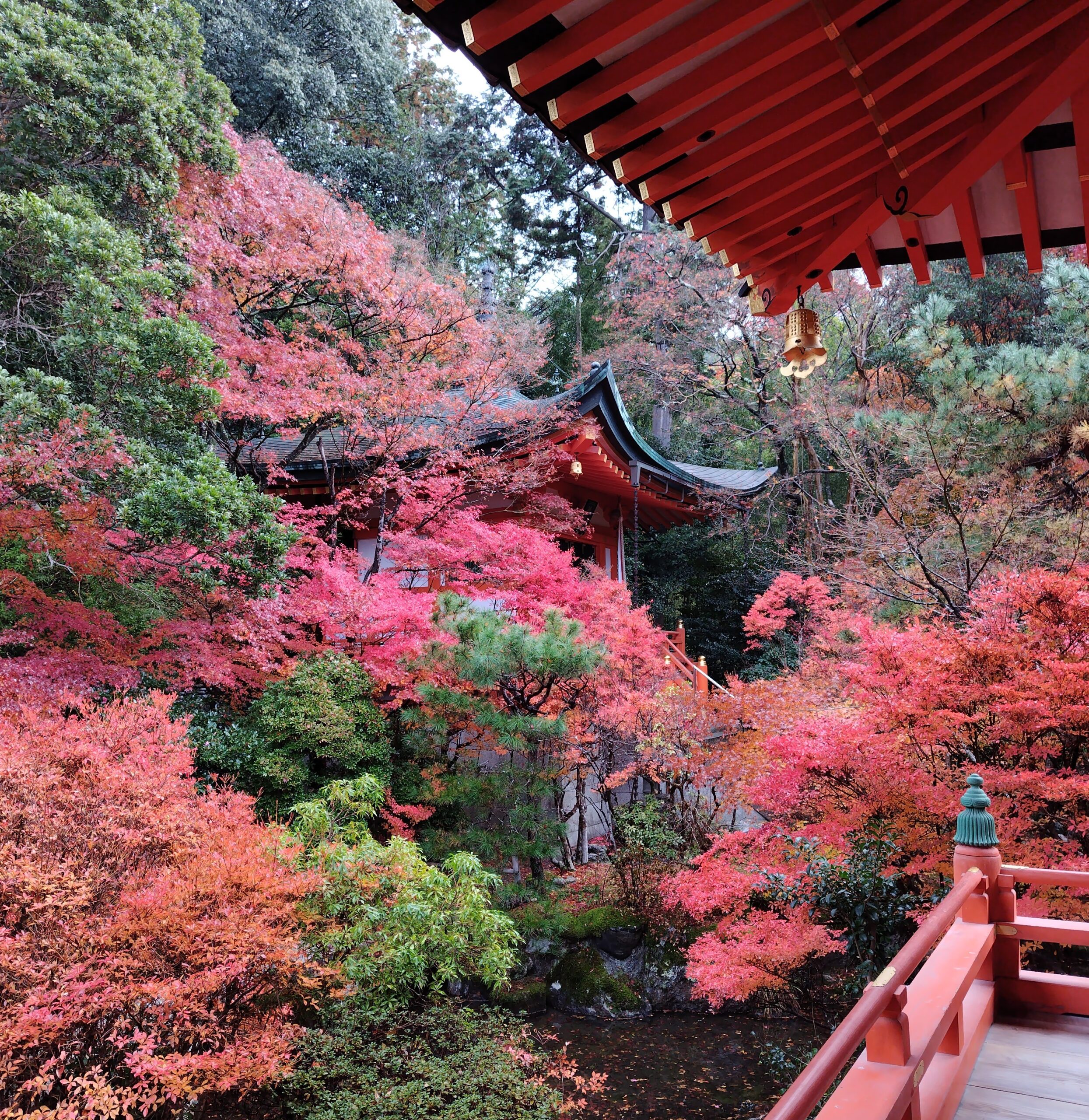 紅葉の便りが出て来た頃に行きたいと思った寺院でした。時間が過ぎていく中、やっぱり行こうと決めたのは奈良の紅葉を見た後の週明け。また月曜日の朝活、先週は嵐山に行ってました。参道にあたる階段に少しだけ落ち葉がありましたが、綺麗に掃除をされているのでしょう。紅葉はどうだんつつじの赤が鮮やかでした。開門の9時前に到着したので、弁才天をお参りし周りのお庭を散策。開門後、本堂をお参りし霊殿から順番に各室の襖絵を拝見し、回廊の外から晩翠園をゆっくり見ていると静寂の中で心が落ち着いていくのが分かりました。また、ここ山科は大石内蔵助が隠棲した場所とあり毎年12月14日には山科義士まつりが毘沙門堂からスタート地点になっています。
