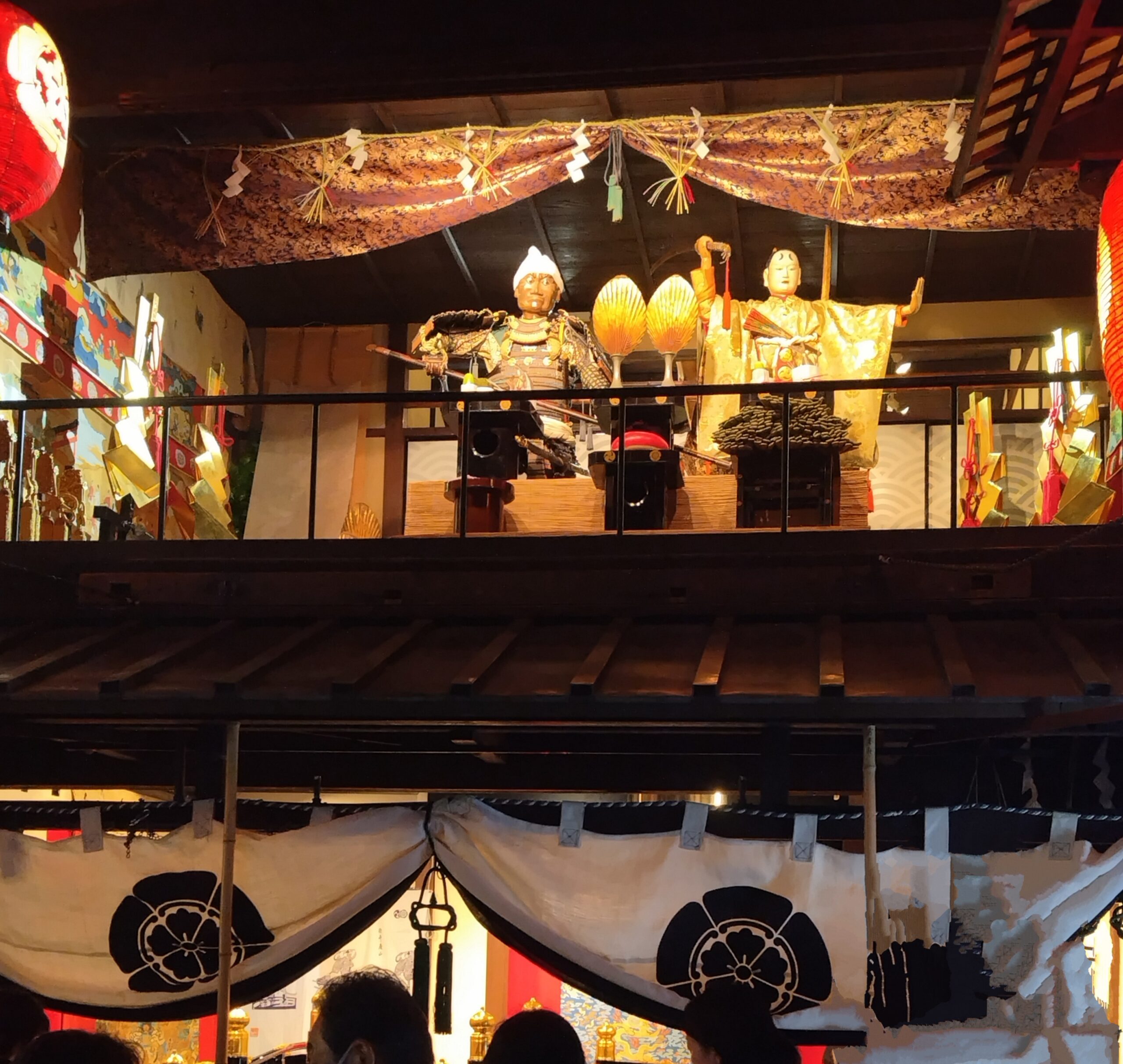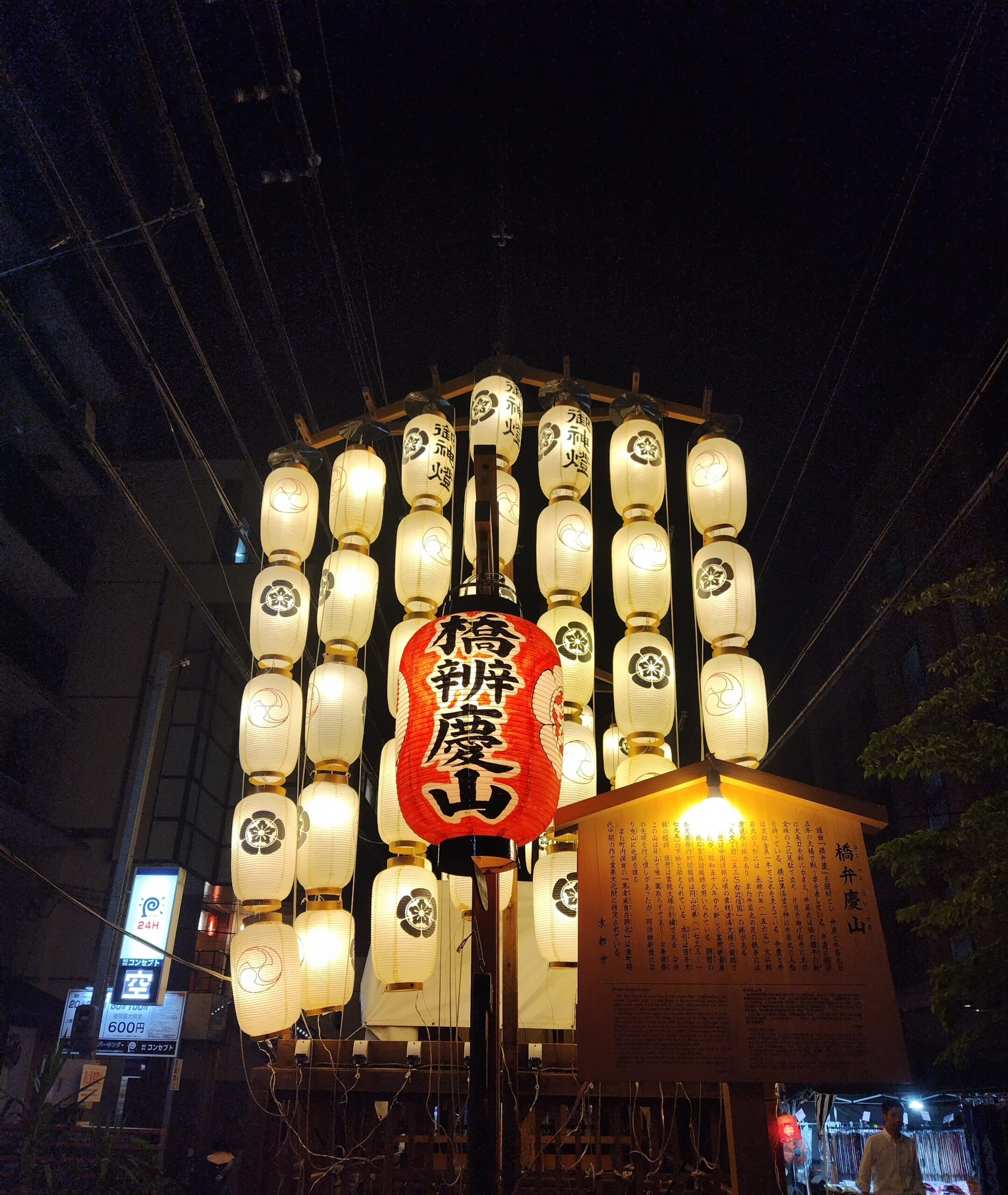 ここ最近の祇園祭りと言えば「朝活」をしてきましたが、昨日は阪急電車が止まっていたので「夜活」に変更しました。夜の祇園祭は8年ぶりです。後祭りでは初めての宵々山です。この日の京都は最高気温は37℃でしたが、夜になれば風もあり少しは過ごしやすくなりました。さて、後祭りと言えば唯一の鉾「大船鉾」が有名です。今回もここから回り始めました。宵々山なのでお囃子も聞けて、気分は上々です。そして先祭りでは買えなかった「粽」も大船鉾で授かることが出来ました。大船鉾から北に上がって行くと新町通りに3基あり、夜が更けて来ると提灯が綺麗に映えて、これぞ祇園祭り!!です。祇園祭りでは、山鉾の町々で古くから伝わる調度品が展示されているのも見所です。今回は、鯉山や橋弁慶山で鑑賞する事が出来ました。滞在時間は2時間程でしたが、最後にかき氷を食べて満足して帰路につけました。祭りは、やはり夜が良いですね(*^^*)