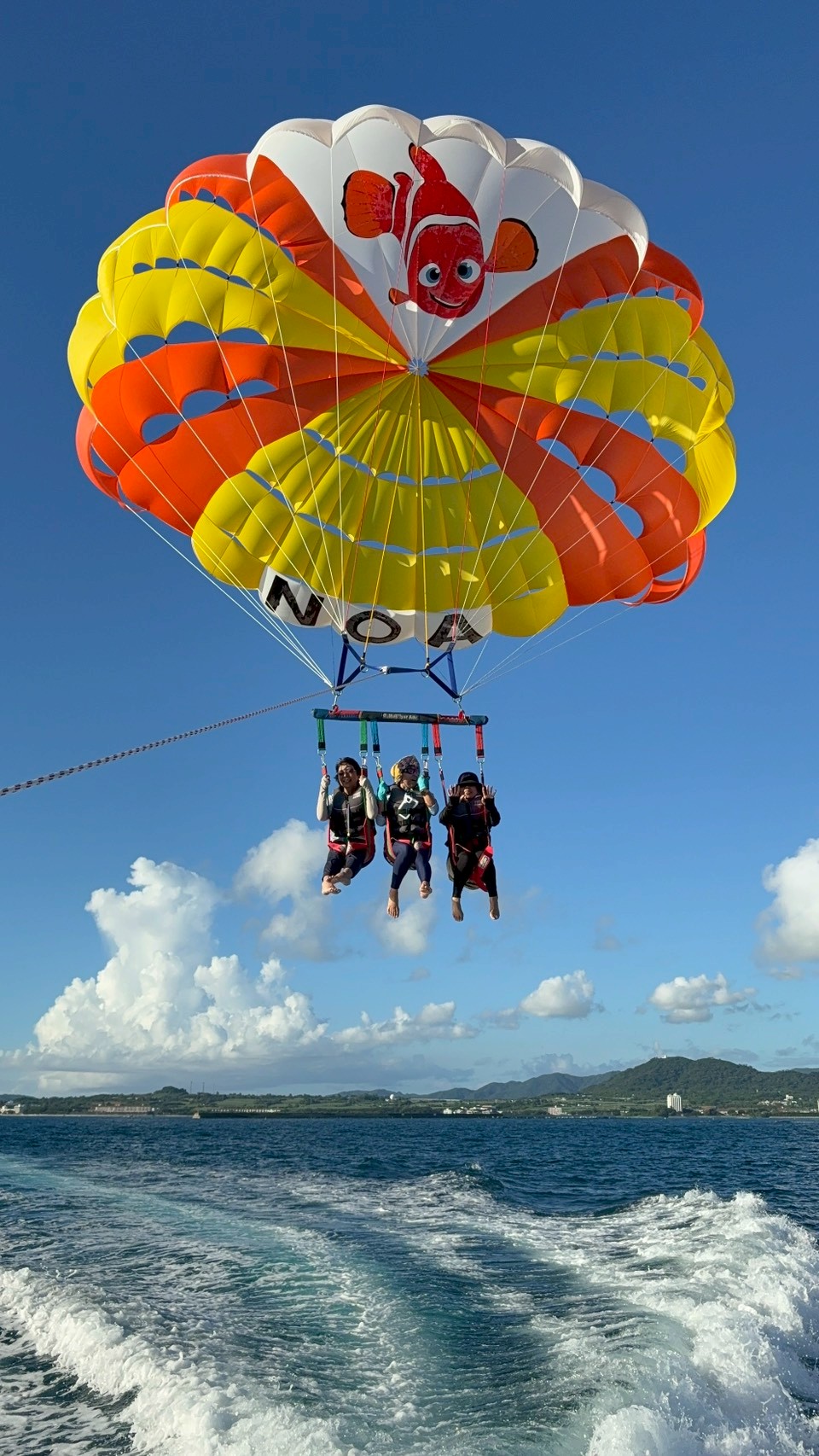 南の島に来る時のアクティビティは、一週間くらい前の天気予報を待って決めていくのですが、一週間前の予報で滞在中の天気は、ほぼ晴れとなっていたので、順番にこだわることなくパズルを当てはめるように決めて行きました。初日は迷うことなく「パラセーリング」に。私は、オーストラリアのケアンズで経験済ですが、二人は初めてで、高さは200メートルと半端ない高さです。だけど、空の青さと心地よい風が恐怖心よりも楽しさが増して、皆で童心に返り大声で叫んでいました。明日も早朝から離島に行きますので、そろそろ寝るとします(^-^)