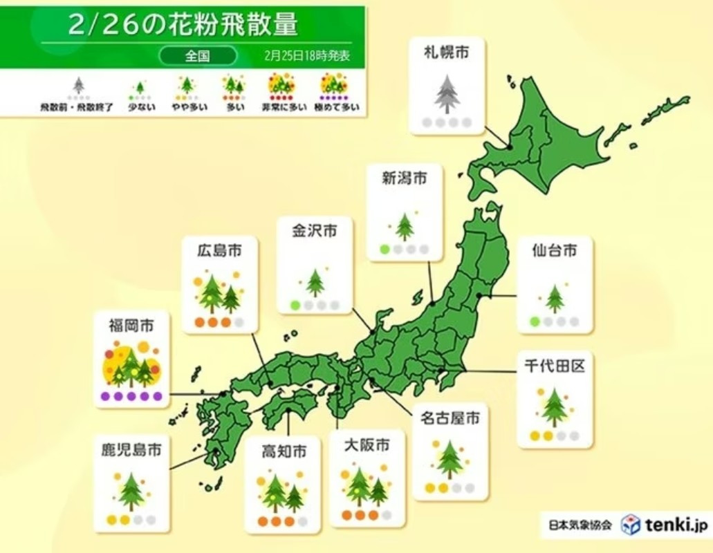 スギ花粉は、2月16日(月)までの観測で、九州から東海の一部、関東南部、東北南部の一部で飛散開始※1が確認されました。2月下旬までに、九州から東北南部の広い範囲で飛散開始となるでしょう。
