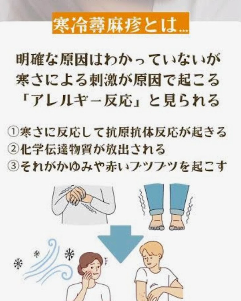 寒冷蕁麻疹とは、体が低温の外気や冷たい物体に触れることで生じる蕁麻疹じんましんで、刺激誘発型蕁麻疹*に分類されます。 寒冷刺激が加...
